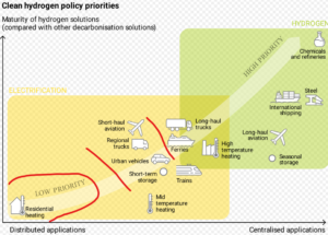 Other applications, such as light duty vehicles and heating in buildings, are no longer part of the future hydrogen economy, primarily for economic and environmental reasons.[10][11] Hydrogen is challenging to store, to transport in pipelines, and to use. It presents safety concerns since it is highly explosive, and it is inefficient compared to direct use of electricity. Since relatively small amounts of low-carbon hydrogen are available, climate benefits can be maximized by using it in harder-to-decarbonize applications.[11]